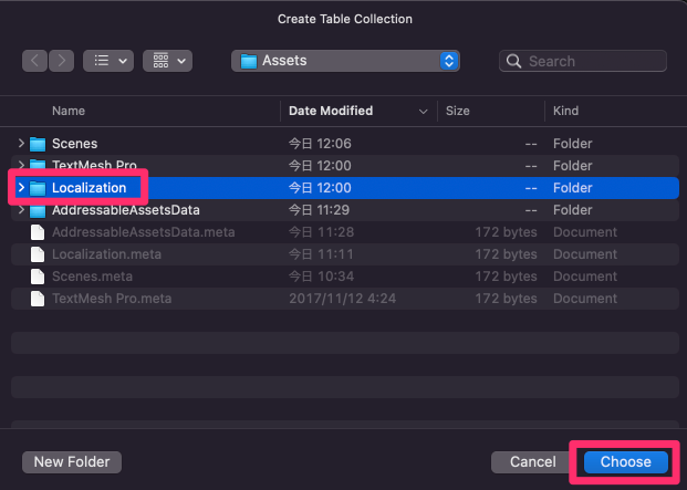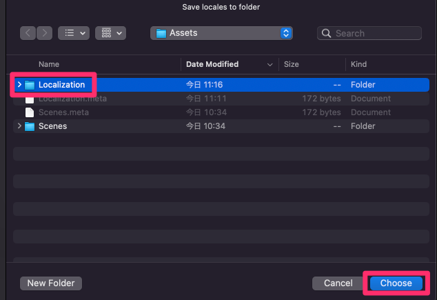 今回は、Assets内に「Localization」というフォルダを作成し保存しました。