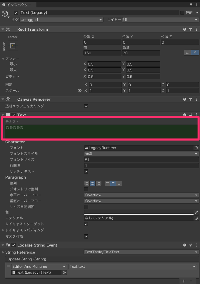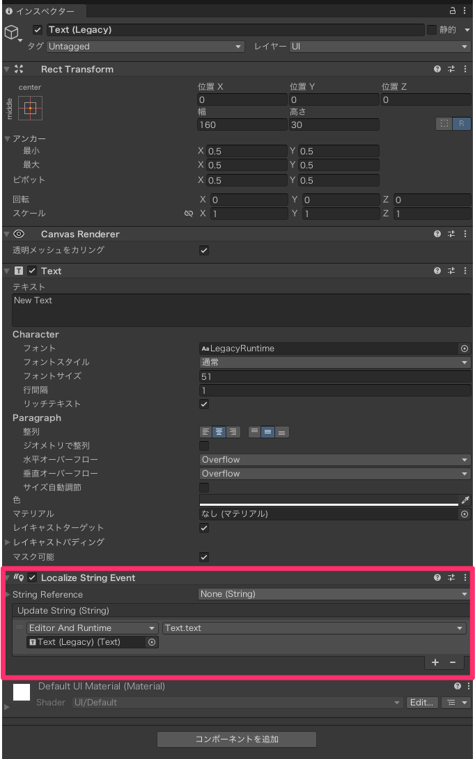 2.テキスト系のコンポーネントが付いたオブジェクトにLocalizeコンポーネントを追加する