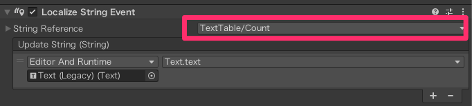 using UnityEngine; using UnityEngine.Localization; using UnityEngine.Localization.SmartFormat.PersistentVariables; using UnityEngine.UI; public class ChangeText : MonoBehaviour { private int number = 0; public Text MainText; void Update() { number++; //Localizationの事前に設定したTableからkeyを指定してテキスト内の変数を変更 //対象のテーブル名:TextTable //対象のKey:Count //対象のテキスト中の変数:XXX LocalizedString textLocalyze = new LocalizedString(tableReference: "TextTable", entryReference: "Count") { { "XXX", new StringVariable { Value = number.ToString()}}, }; //変数更新後の文字列を代入 MainText.text = textLocalyze.GetLocalizedString(); } }