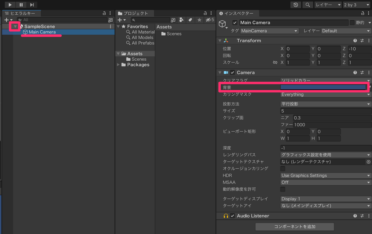 すると、インスペクターウインドウに「Main Camera」が持つ機能一覧が表示されます。
