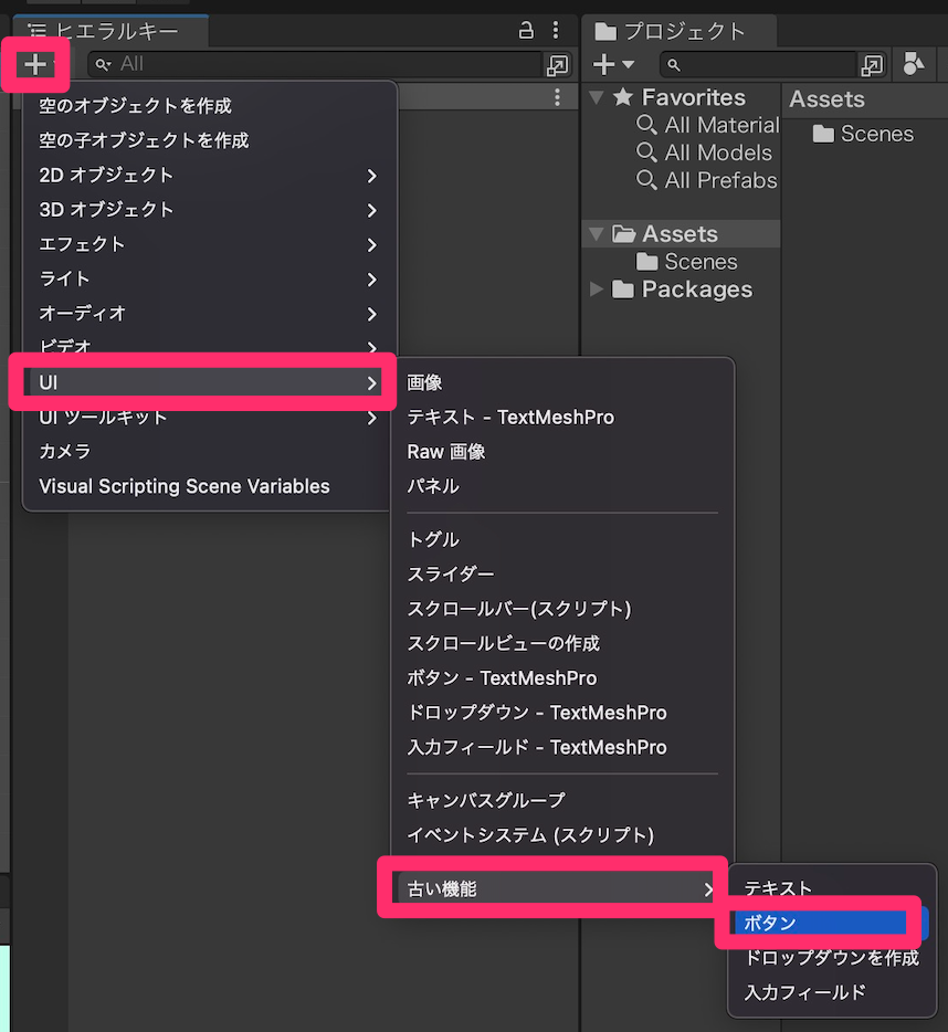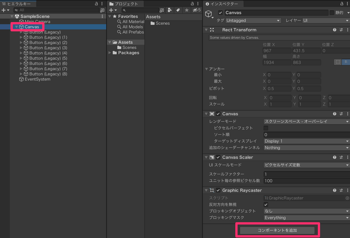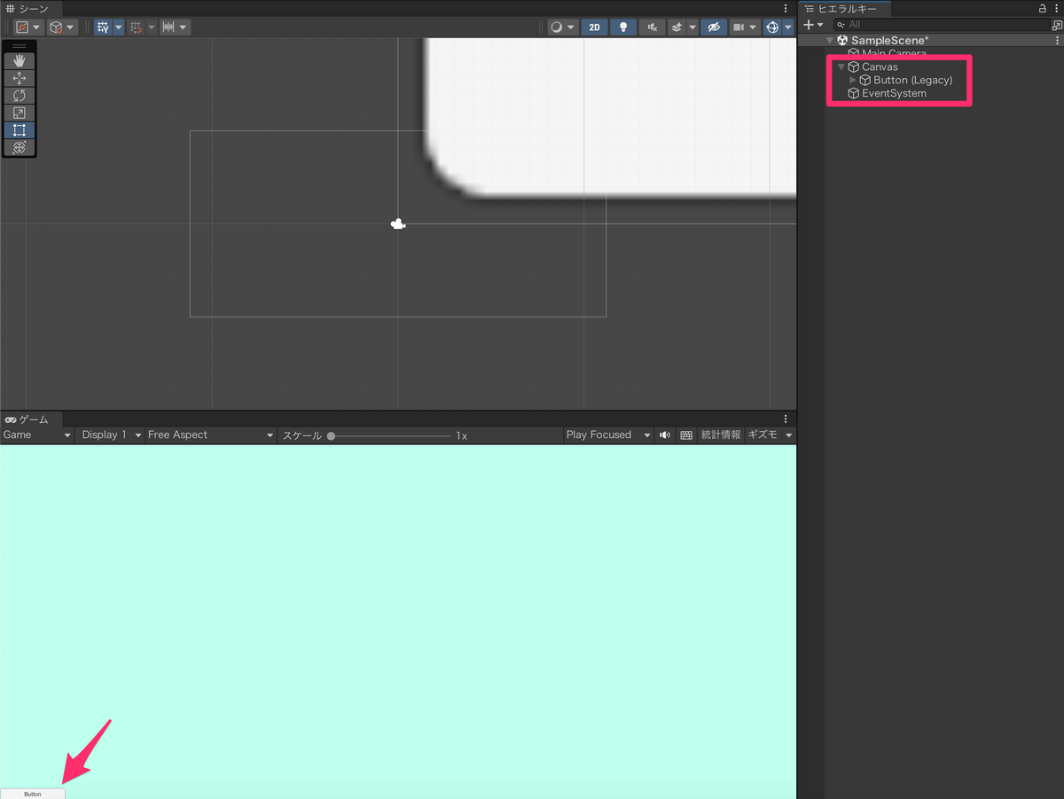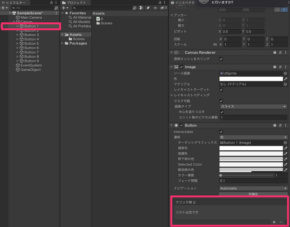 また、ヒエラルキーにはCanvas、Button、EventSystemが生成されています。
