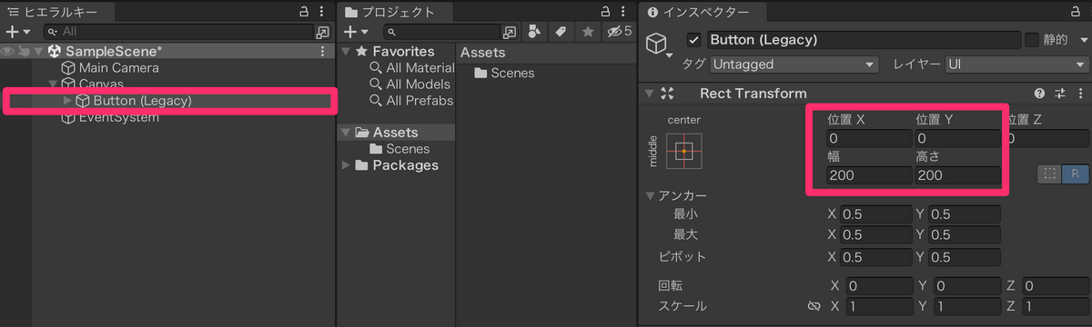 大きさと位置は、Button(Legacy)をクリックした後に表示されるインスペクターウインドウの