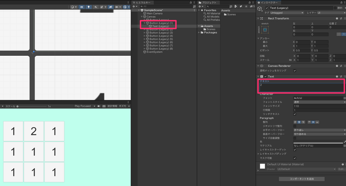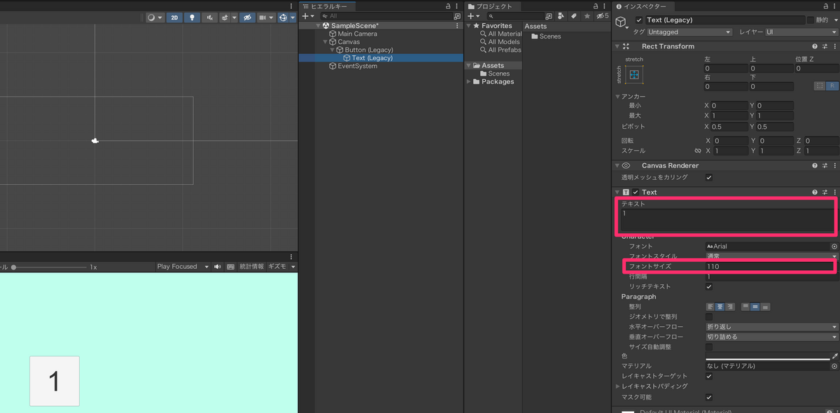「Button 1」 をクリックすると、インスペクターにButtonコンポーネントが表示されます。