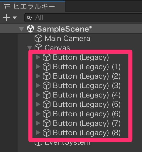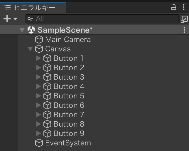 ヒエラルキーを見ただけではどのボタンオブジェクトがゲームビューのボタンに