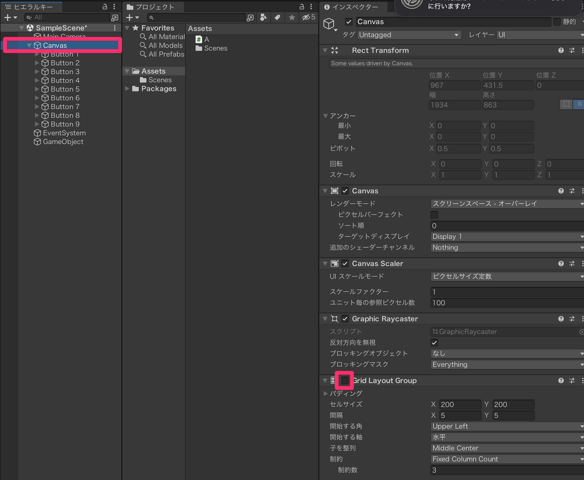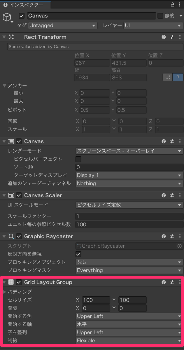 これはCanvasに追加した「Grid Layout Group」コンポーネントが