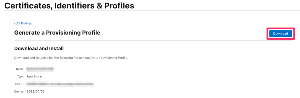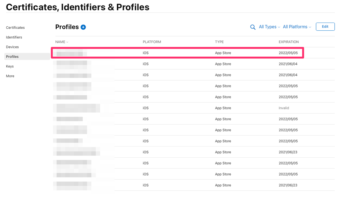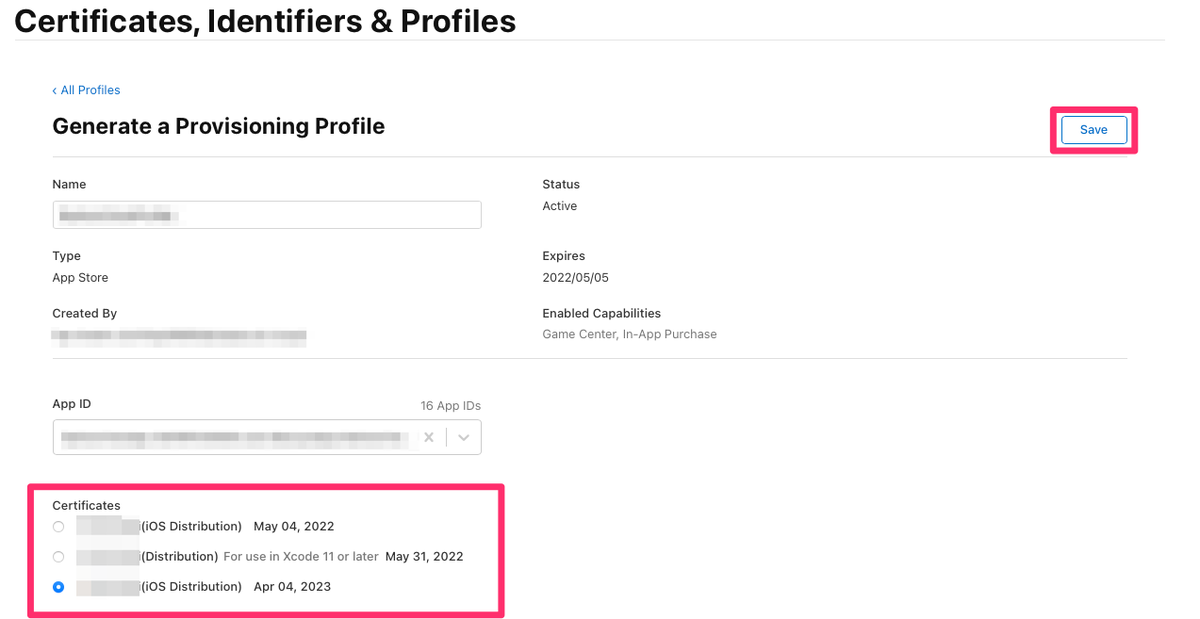 今回作ったCertificateを選択する(有効期限が一番長いもの)