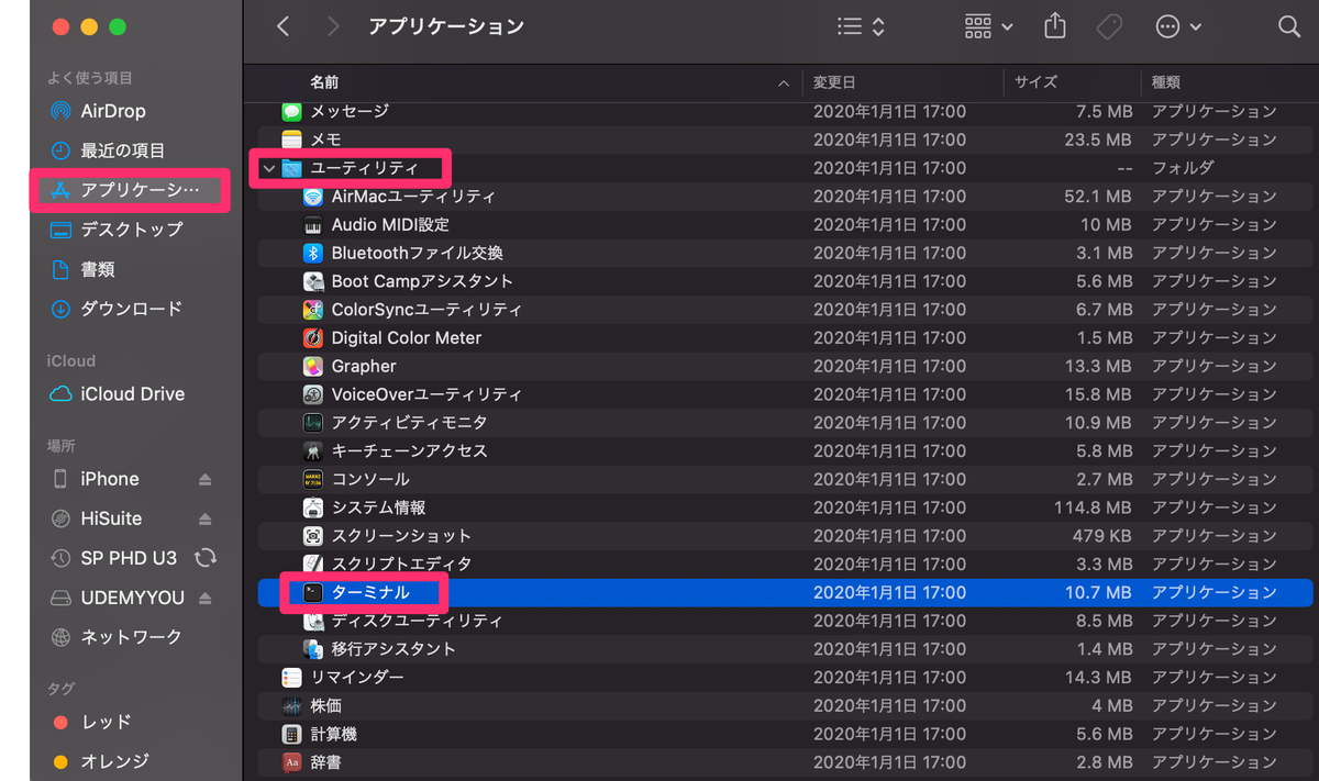 Finder>アプリケーション>ユーティリティ>ターミナル