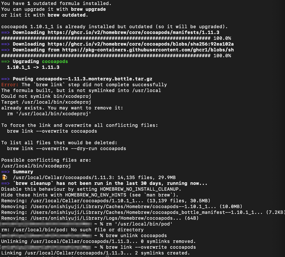 brew install cocoapods rm '/usr/local/bin/pod' brew unlink cocoapods brew link --overwrite cocoapods