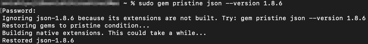 →ターミナルで sudo gem pristine json --version 1.8.6 を実行したことが気になり、