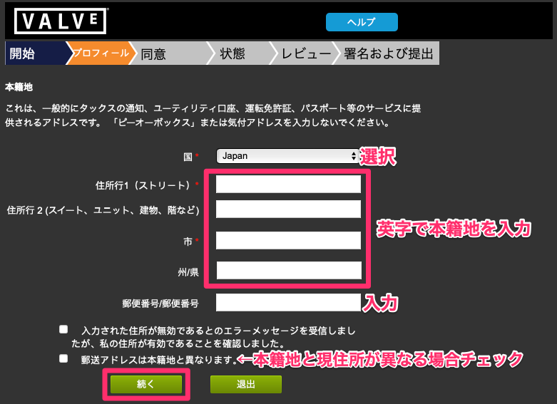住所が問題無ければ下記のチェックボックスにチェックして「続く」を押します。