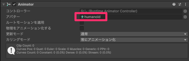 Animatorコンポーネントの"Avatar"はすでに設定されているので予めを削除しておきます。