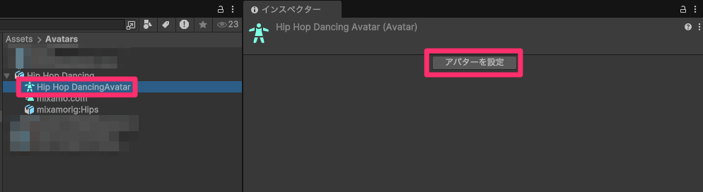 Unity上にて3Dモデル配下のAvatarを選択し「アバターを設定」を押すと表示される情報を