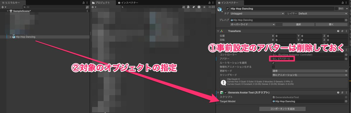 作成した"GenerateAvatarTest"スクリプトを割り当てて"Target Model"を指定します。