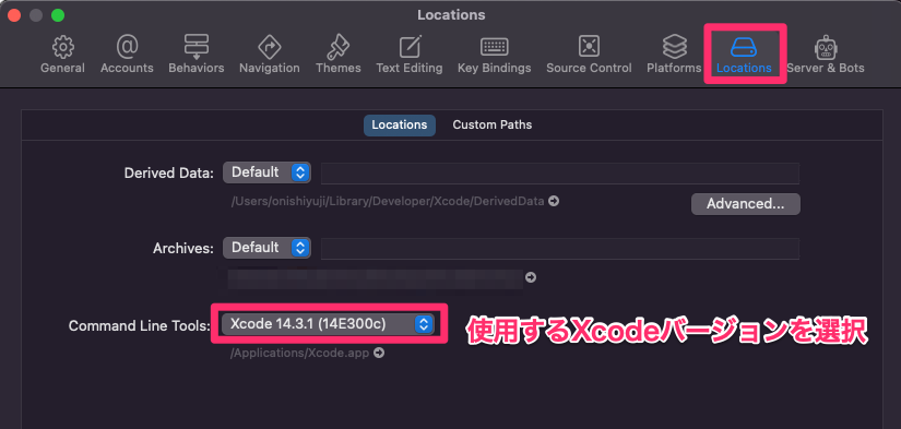 →Command Line Toolsで使用するXcodeバージョンを選択します。